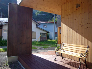 1階に店舗、LDK+水周りを配置し、その南及び西側にウッドデッキテラスをL字に設けました。ウッドデッキを部屋の延長として、またアプローチとして活きた空間にするために、1間分セットバックさせ、直行方向に並ぶ短い壁で上階を支持しています。この壁は、構造的な耐力壁であると共に、LDへ光を届けつつも前面道路からの目隠しや心理的な境界線にする為の壁であり、並列した店舗部分と住宅部分を分ける壁でもあり、また外観デザイン上のアクセントでもあります。この部分の仕上げには外壁面・天井面共に松板貼りとし温かみのあるスペースとして他の部位とは変化をつけました。